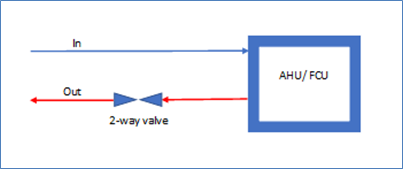 2-way valve mirip dengan 3-way valve; memodulasi aliran air melalui cooling coil secara proporsional dengan beban. Bedanya adalah 2-way valve hanya mengurangi jumlah air yang melewati coolong coil.