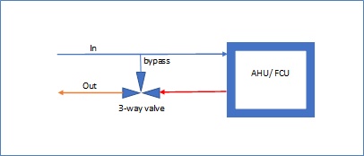 3-Way Valve adalah salah satu metode yang digunakan untuk mengatur aliran air dingin melalui cooling coil. Ketika beban pendinginan ruang berkurang, katup modulasi menutup mengurangi air masuk ke cooling coil, mengurangi kapasitasnya. Kelebihan air akan di bypass dan bercampur ke dengan air yang keluar dari cooling coil. Akibatnya, suhu air yang kembali dari sistem lebih rendah saat beban pendinginan ruang berkurang.