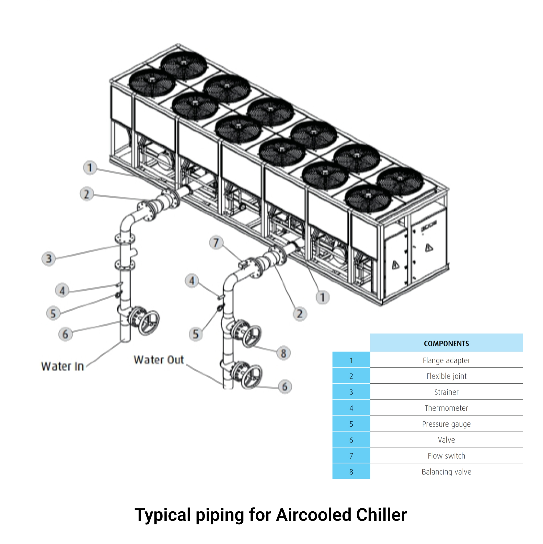 Dalam proses instalasi chiller, pemilihan komponen aksesori seperti flexible joint, elbow, valve, check valve, dan balancing valve menjadi sangat penting. Komponen-komponen ini sebaiknya dipilih dengan pressure drop yang rendah untuk memastikan kinerja sistem yang optimal. Selain itu, perlu diperhatikan bahwa instalasi dengan jumlah belokan yang berliku akan menambah kebutuhan lift pompa, sehingga sebaiknya mengurangi jumlah belokan sebisa mungkin. Air venting juga merupakan bagian penting dalam sistem, karena berfungsi untuk membuang udara yang terjebak di dalam piping system. Penempatan air venting sebaiknya dipasang pada posisi header dan pipa tertinggi untuk memastikan udara dapat dibuang dengan efektif.